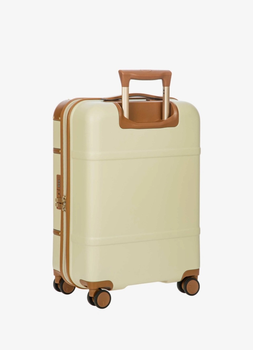 La Collezione Bellagio è caratterizzata dal design inconfondibile, il più iconico di sempre. Il trolley misura cabina è realizzato in policarbonato riciclato, un materiale leggero, flessibile e ultra-resistente agli urti. La chiusura è dotata di lucchetto TSA e di cerniera lampo ultra-sicura: questo sistema è resistente all’intrusione, assicurando un ottimo livello di protezione in caso di tentativo di furto. Internamente lo spazio è dotato di sistema di compressione ed è diviso in due scomparti per favorire l’organizzazione dei propri oggetti. La fodera interna è facilmente removibile tramite l’apertura di una zip: in questo modo, in caso di necessità, può essere lavata separatamente. Per garantire il comfort di utilizzo, il sistema di traino è composto da tubi in alluminio robusti e stabili, multistop per regolare l’altezza della maniglia in base alle esigenze, con impugnatura ergonomica. Le quattro doppie ruote sono silenziose e piroettanti per garantire il movimento agevole a 360°, dotate di cuscinetti a sfera che ne favoriscono la scorrevolezza. Le ruote inoltre sono incassate nel guscio, aumentando così la capienza del trolley. Il trolley Bellagio è impreziosito dai dettagli in vera pelle, segno distintivo di Bric’s, e dai raffinati particolari con logo. Il tocco finale è dato dal porta indirizzo in pelle. Inclusa la custodia trasparente.