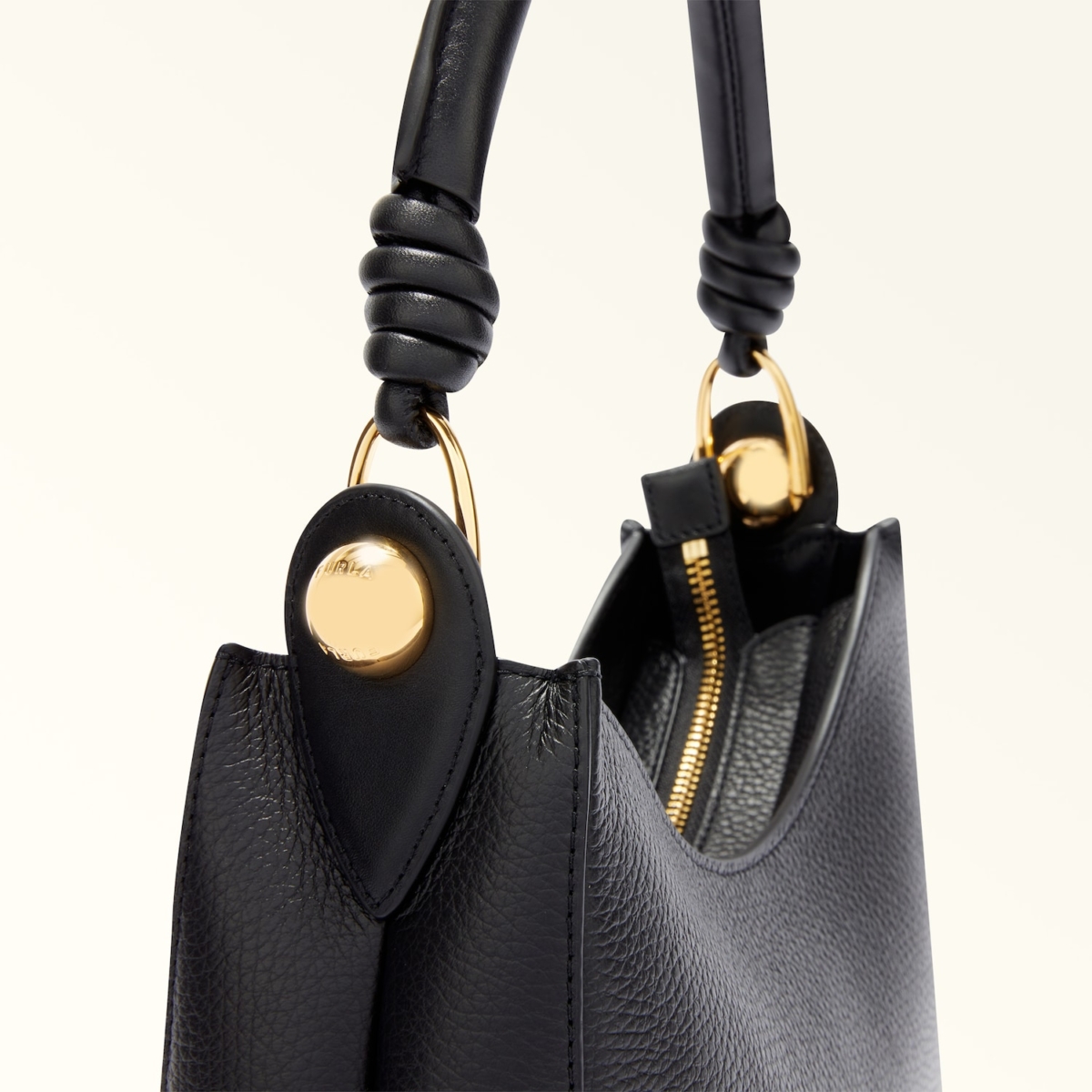 Moderna ed elegante nelle forme arrotondate: Furla Sfera è realizzata in pregiata pelle martellata e arricchita da dettagli in pelle liscia con hardware a Sfera punzonati sui lati. Il modello hobo è piccolo ma capiente a sufficienza per riporre i propri effetti personali. Comoda da indossare a spalla grazie alla tracolla regolabile e rimovibile, può essere indossata anche in versione top handle con manico rigido.