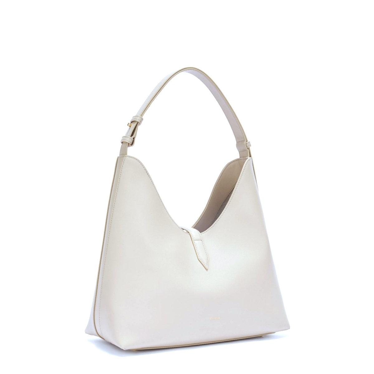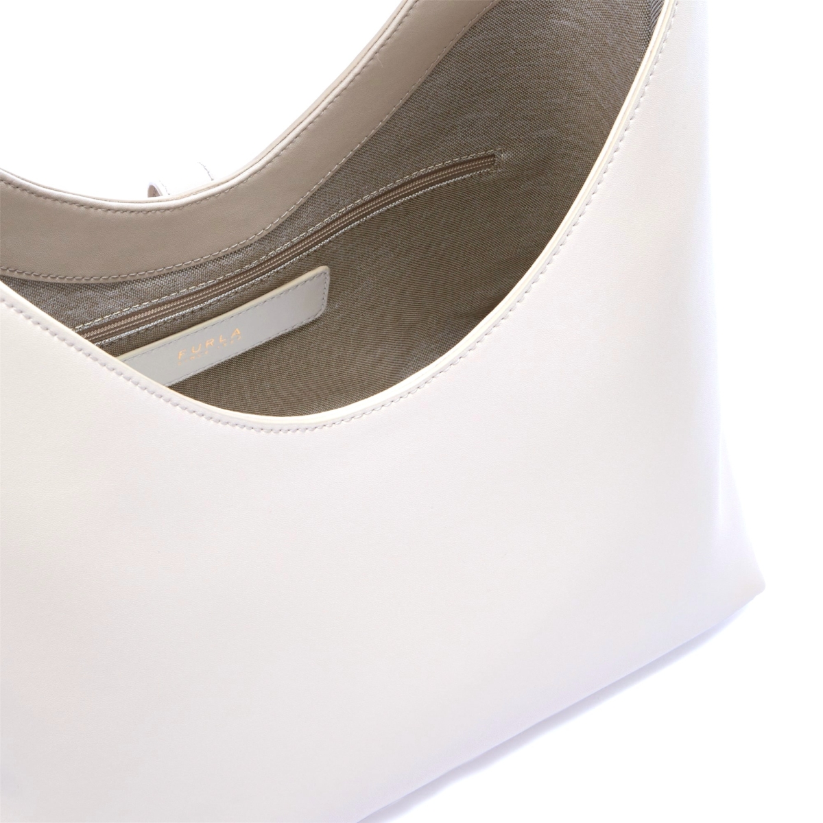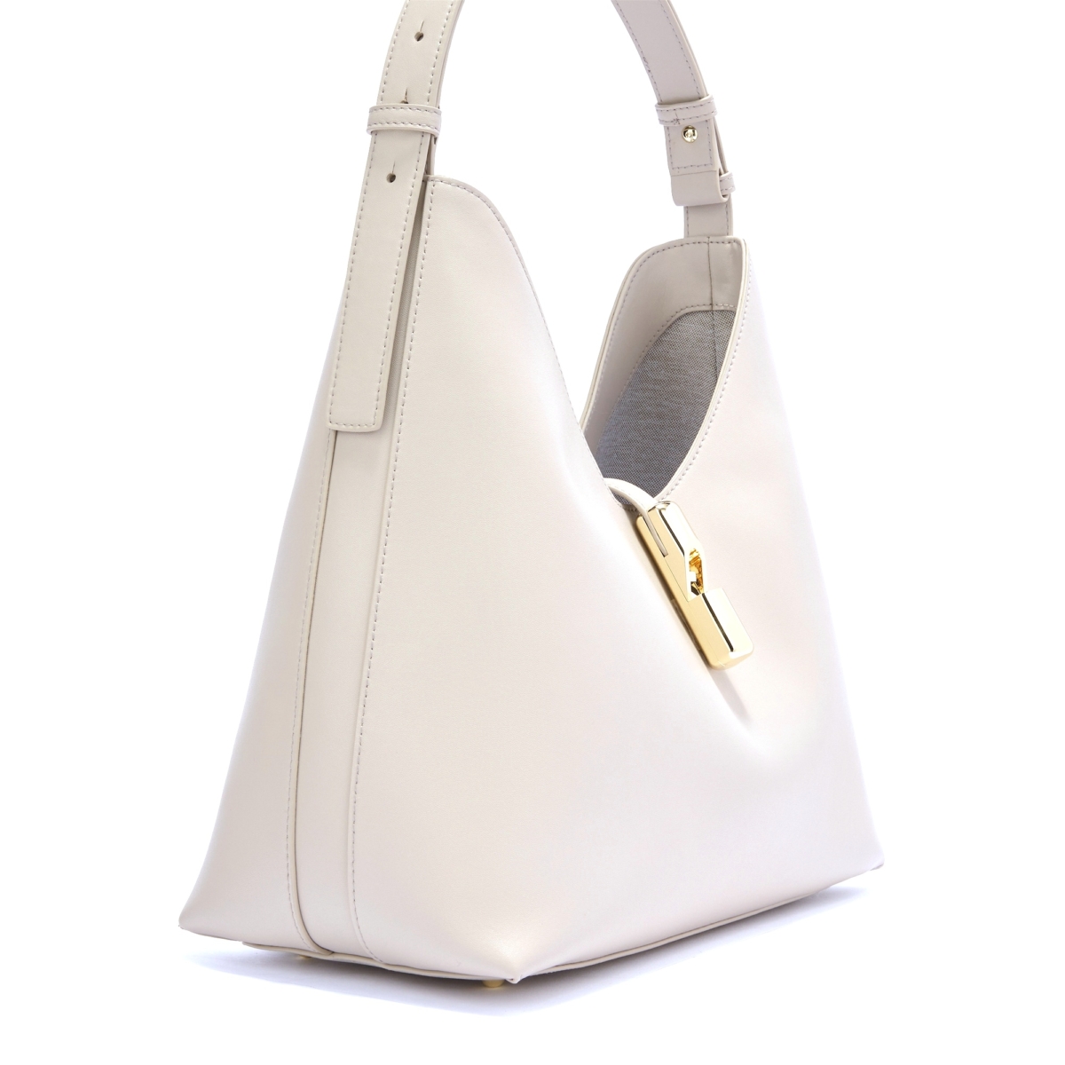 La hobo bag Furla Goccia si distingue per la silhouette morbida e destrutturata realizzata in pelle liscia dalla mano setosa e ricca. La borsa è arricchita da una fascetta abbinata impreziosita dal nuovo hardware ciclindrico con pesetto decorato dall’iconico logo Arco Furla che tiene chiuso il modello. L’interno aperto è capiente e spazioso per contenere i propri essentials.