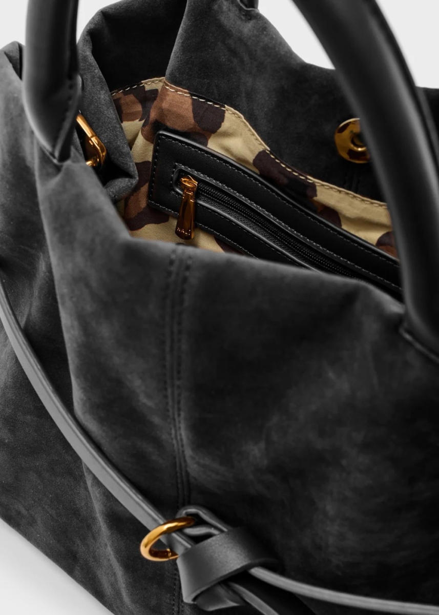 Borsa in simil suede marrone con manici rigidi e cintura decorativa. Elegante e strutturata, è perfetta per l’ufficio o appuntamenti importanti.