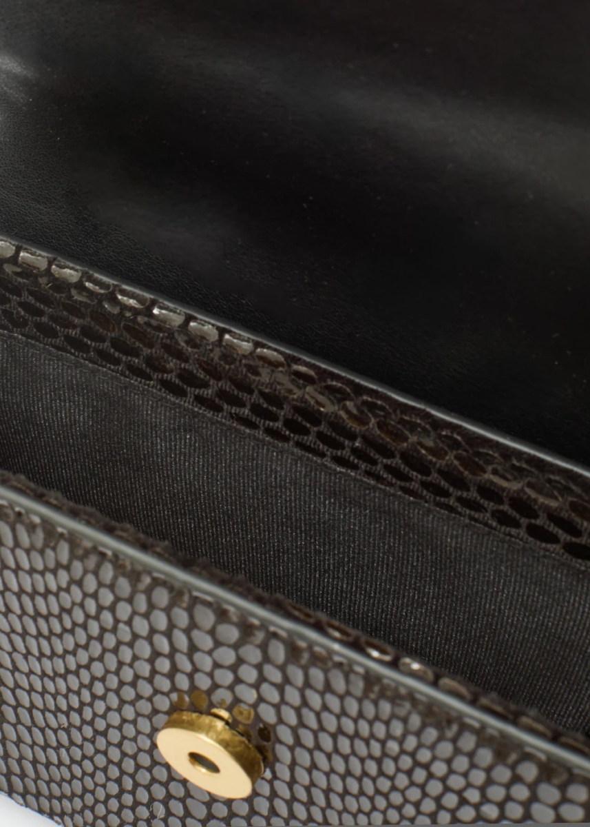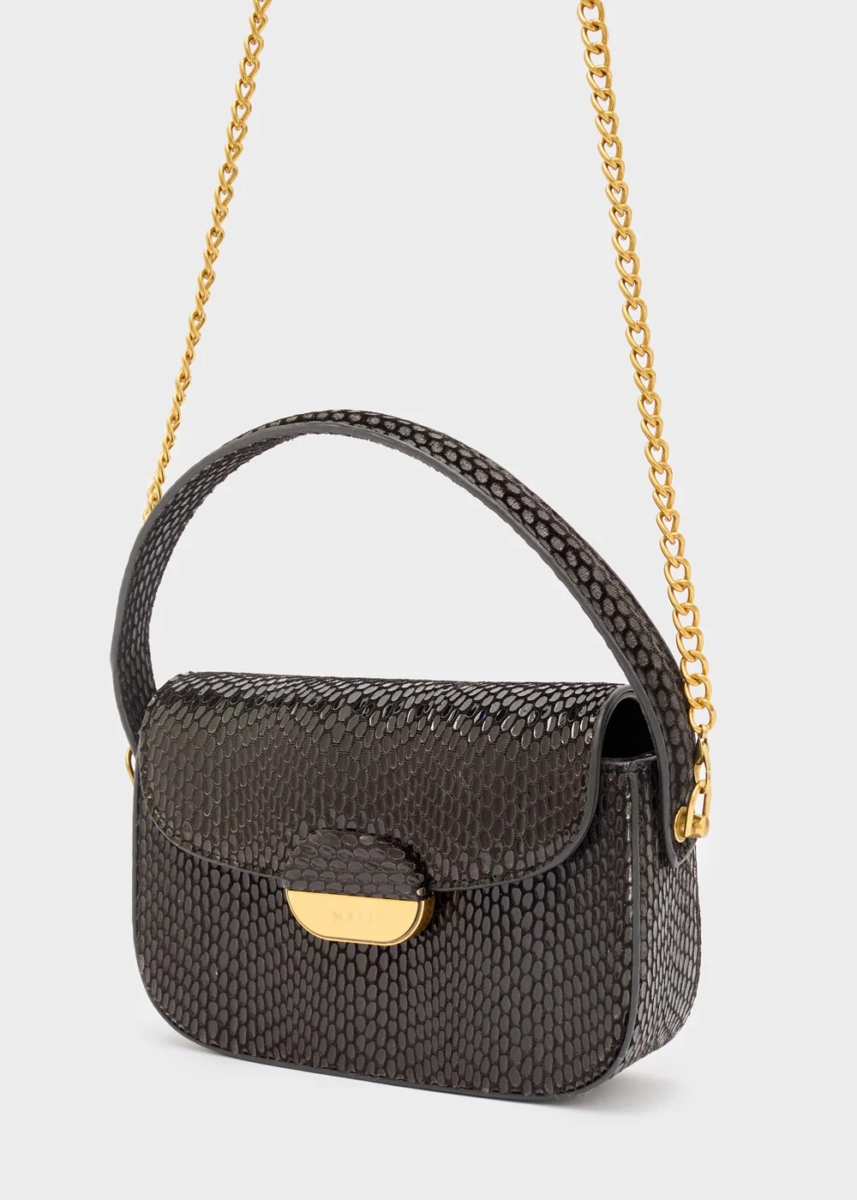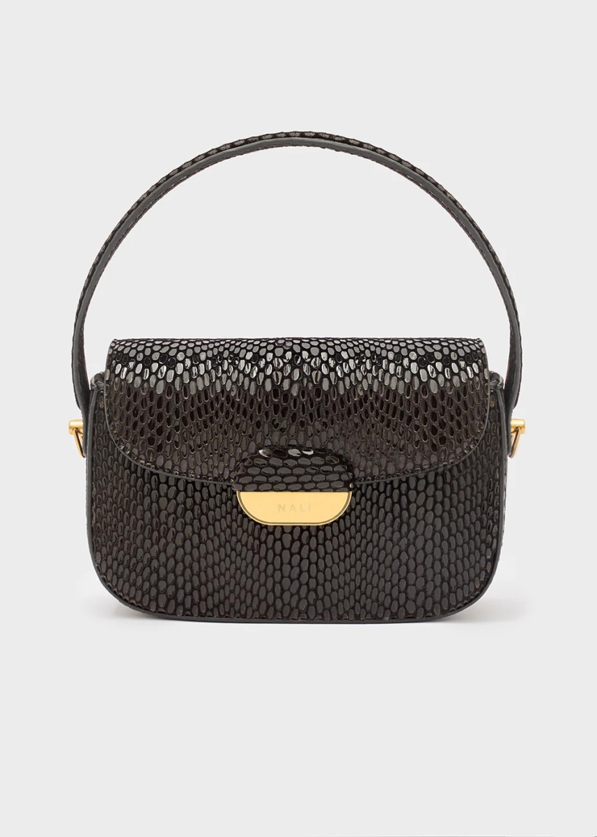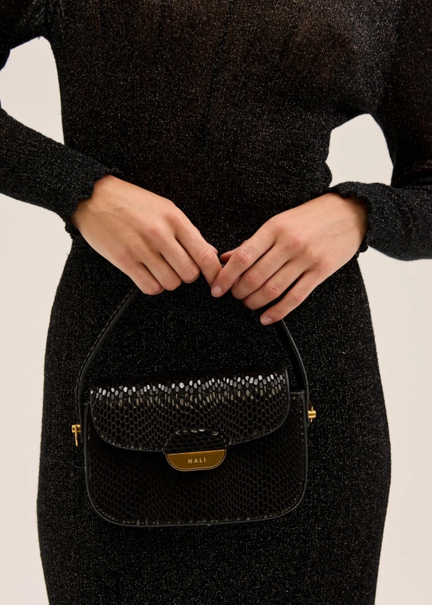 Borsa a mano effetto pitone con patta frontale e manico rigido. Logo NALÌ e chiusura a scatto magnetico.