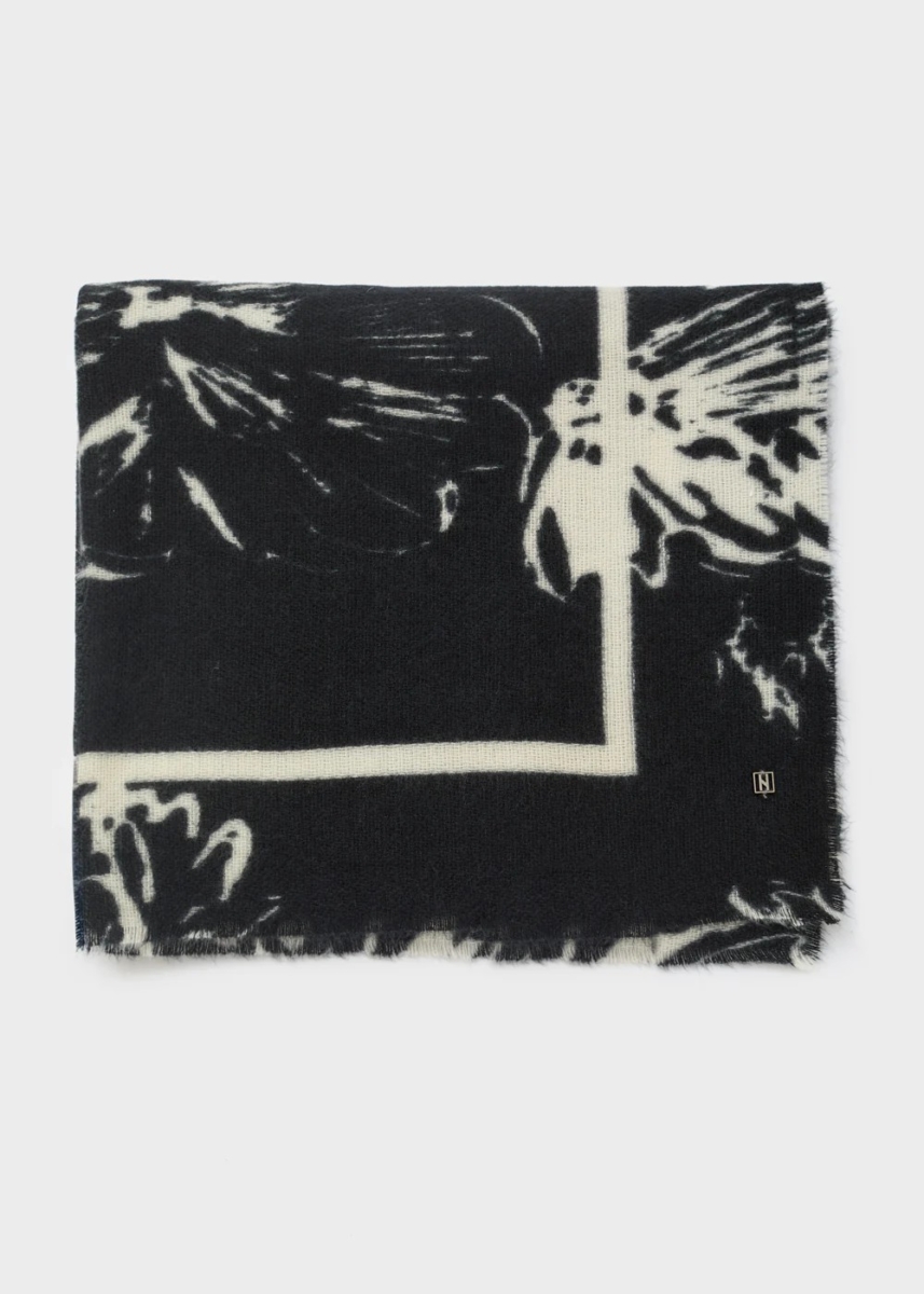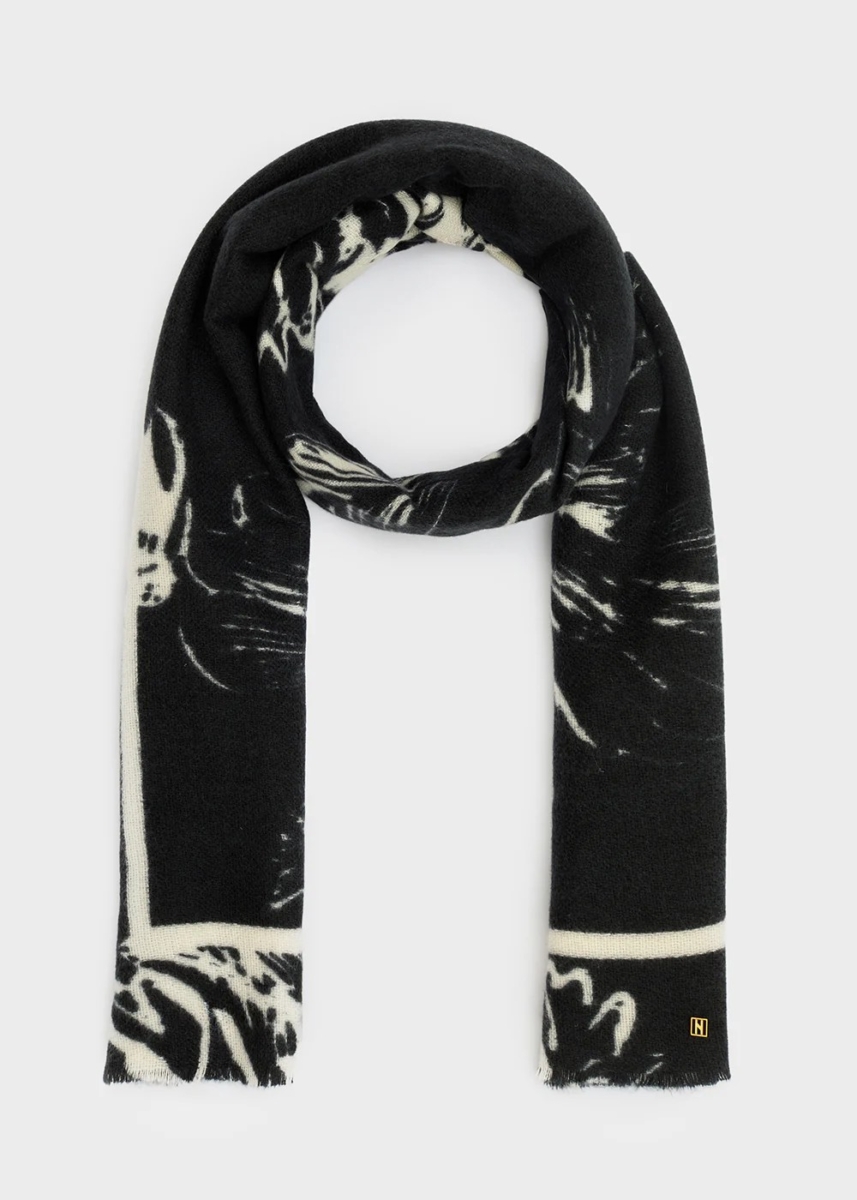 Sciarpa morbida e avvolgente con maxi disegno astratto, ideale per aggiungere un tocco di personalità e originalità agli outfit invernali.